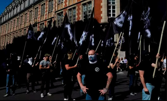 Membros do Comité du 9 Mai, um grupo neofascista, durante um comício em Paris, em 10 de maio de 2025. GEOFFROY VAN DER HASSELT / AFP