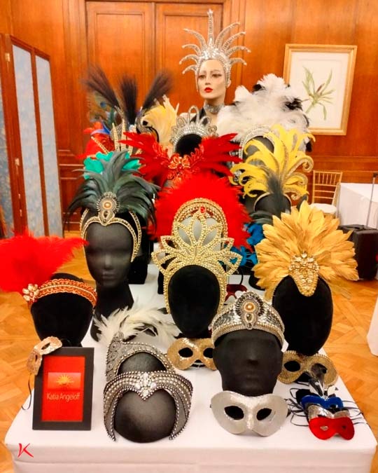 Katia Angeloff é especialmente famosa pelas máscaras e acessórios que cria, há quatro décadas, para o Carnaval. Katia realiza exposições anuais no Copacabana Palace, onde suas obras de arte são destaque em bailes de pré-carnaval.