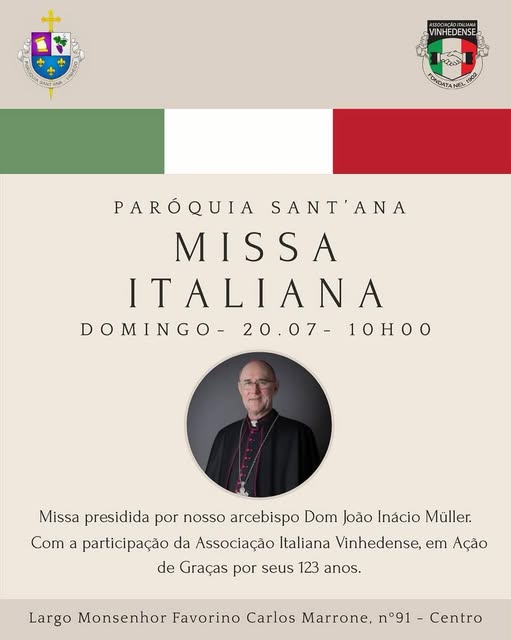 Neste domingo, 20 de julho de 2025, a cidade de Vinhedo será tomada por um clima de emoção e reverência. A Associação Italiana Vinhedense, fundada em 1902, celebra seus 123 anos de existência com uma Missa em Ação de Graças celebrada em italiano, reunindo autoridades, representantes da comunidade ítalo-brasileira e fiéis na Igreja Matriz Sant’Ana.